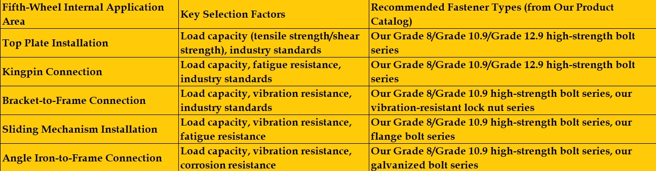 পঞ্চম চাকা সিস্টেমটি ট্র্যাক্টর এবং ট্রেলার সংযোগে গুরুত্বপূর্ণ ভূমিকা পালন করে, যা নিরাপদ এবং দক্ষ পরিবহনের জন্য প্রয়োজনীয়। যথাযথভাবে ফাস্টেনারগুলি সঠিকভাবে নির্বাচন করা এই সংযোগের অখণ্ডতা এবং পরিষেবা জীবনের জন্য গুরুত্বপূর্ণ, সরাসরি সুরক্ষা এবং অপারেশনাল নির্ভরযোগ্যতাকে প্রভাবিত করে। এই নিউজলেটারের লক্ষ্য পঞ্চম চাকা অ্যাপ্লিকেশনগুলির জন্য ফাস্টেনারগুলি নির্বাচন করার সময় বিবেচনা করার মূল কারণগুলির মাধ্যমে আমাদের সংস্থার পণ্য ক্যাটালগের উপর ভিত্তি করে গ্রাহকদের গাইড করা।